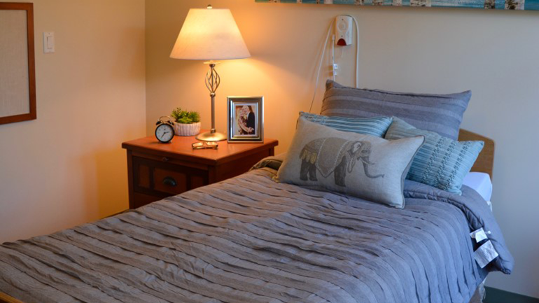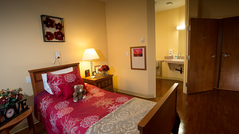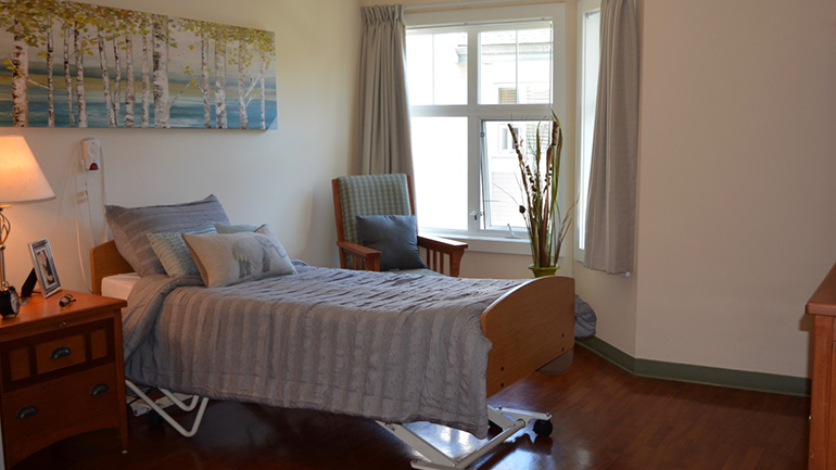 | Room features | Mobility friendly studio with ensuite and high ceilings; furniture includes an armoire, dresser, chair, night table lamp and night light. Linen, pillows and towels provided. We encourage residents and families to bring items to personalize one’s suite with their favourite décor or furnishings, including a featured shadow box. |