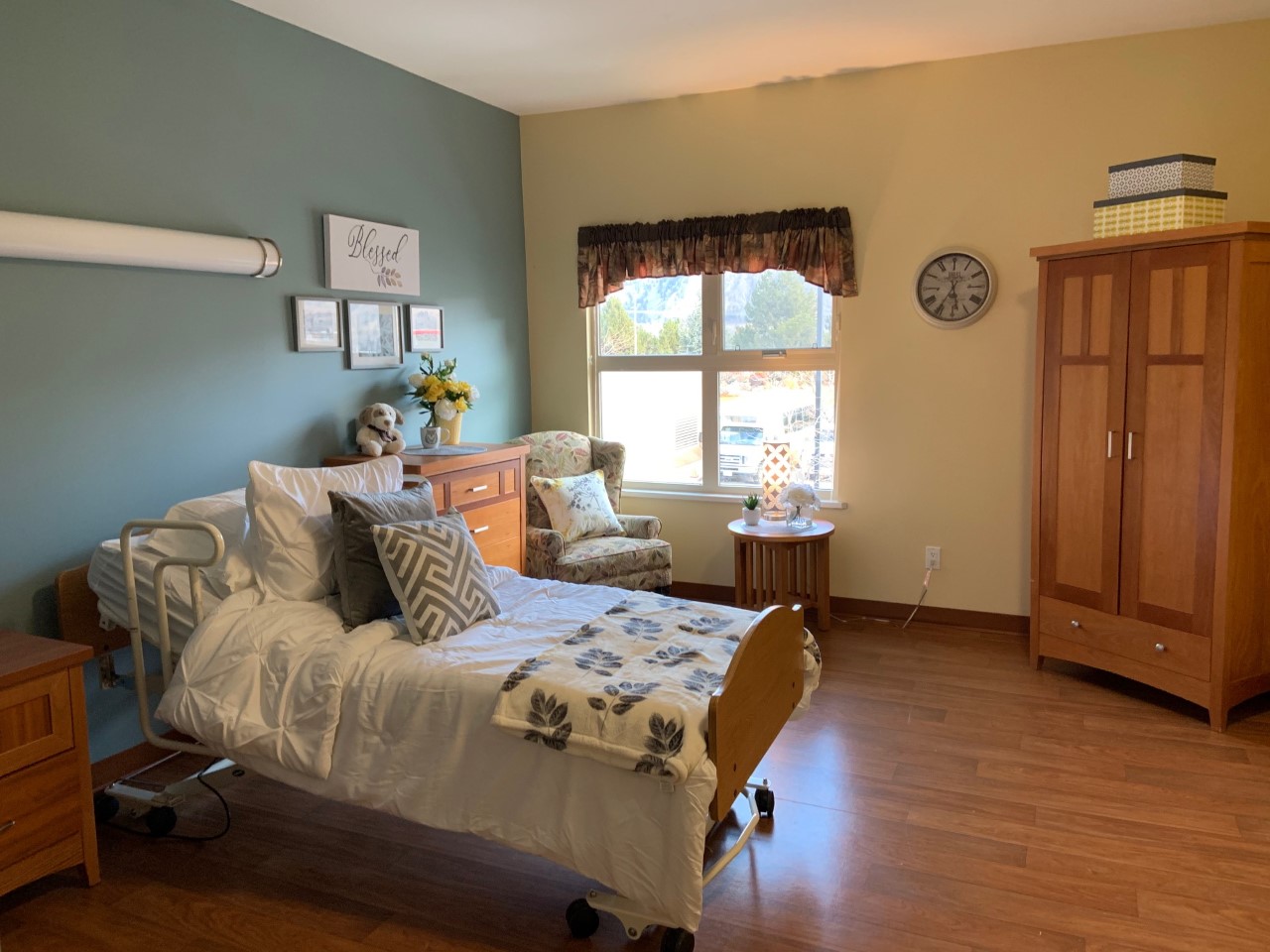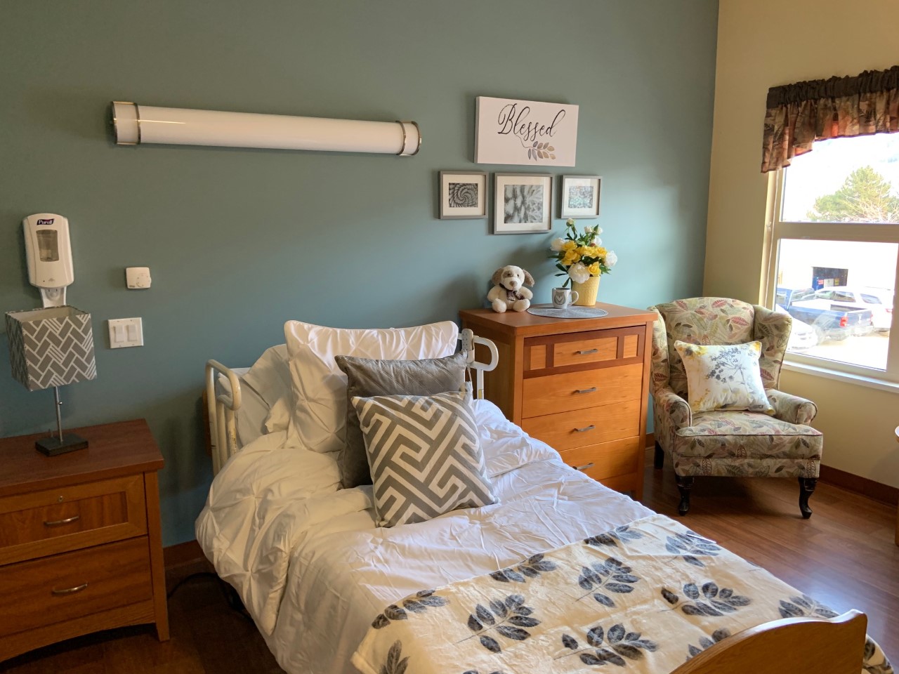 | Room features | Rooms have their own washroom and are outfitted with a mechanical bed, dresser, wardrobe and side table. There is also a neighbourhood for young adults with a washroom. Bed and bath linens are provided. Residents are encouraged to personalize their room with pictures, decorations, special ornaments and personal mementos. They may bring in their own television, computer, radio, phone and a recliner or lift chair. Rugs or carpets, rocking chairs, personal fridges and other large furniture items are not permitted. In-room television, telephone and Wi-Fi. |