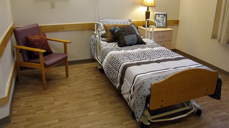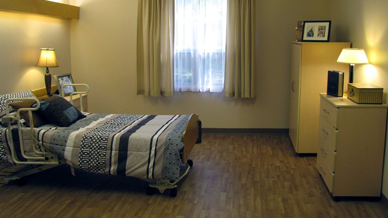 Studio suites with high ceilings and a large window to view to nature. Suites include an ensuite, mobility bed, pillow, blanket and linens, armoire, dresser, chair, night table and nightlight. Bring your favourite décor and comforter as you wish. |