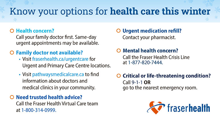 For mental health/substance use concerns, call the 24/7 Fraser Health Crisis Line at 604-951-8855 or toll free at 1-877-820-7444.