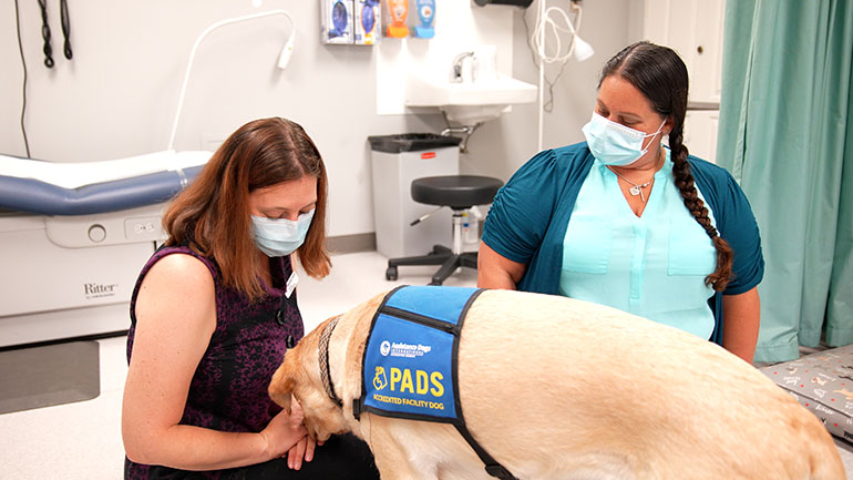 Embrace Clinic opened in 2015 and was mobile until 2021, when it secured a home across from Surrey Memorial Hospital. Fraser Health provided the space and staffing and Surrey Hospitals Foundation donated furniture and a new exam table. Armstrong Flooring donated new flooring. And nothing says home quite like a dog. Levi, a Pacific Assistance Dogs Society (PADS) Accredited Facility Dog, recently joined the team to support survivors in a way that only a trained facility dog can.