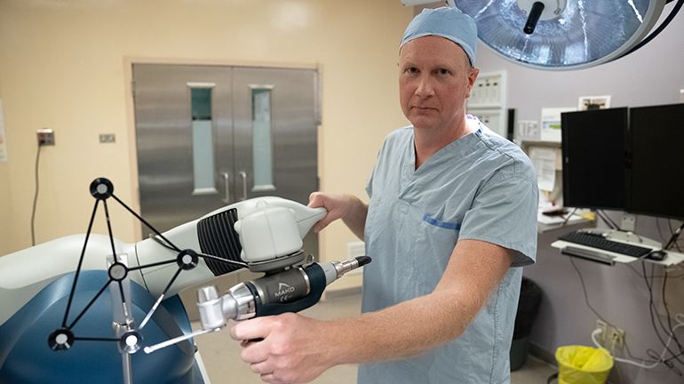 The new system uses CT imaging to create a 3D image of the joint, allowing surgeons to make a customized plan based on their patient’s anatomy. A surgeon guides the robotic arm during surgery, adjusting as necessary, based on visual and audio cues from the arm’s software. At all times, the surgeon, not the robotic arm, is controlling the operation.