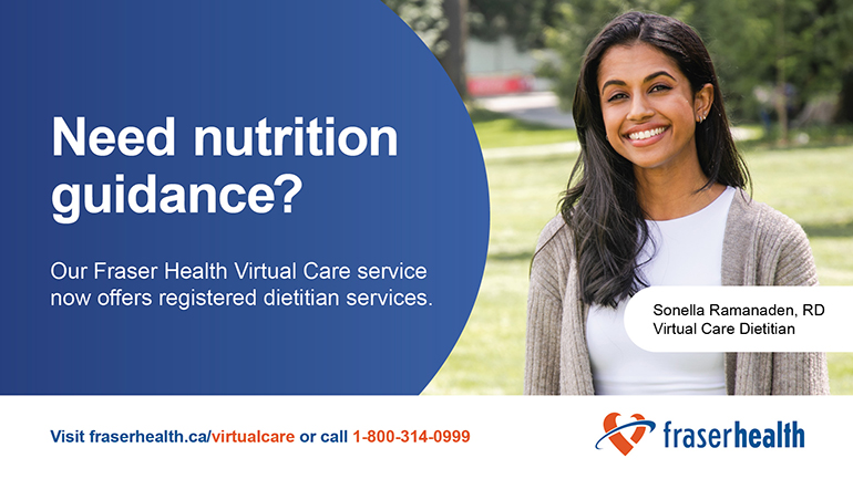 “Integrating a registered dietitian into our virtual care team is an exciting step forward in being able to provide more well-rounded care to our patients,” says Sonia Jose, special projects lead, Virtual Health Clinical Operations. “This new role will enable us to provide personalized nutrition guidance and help people in Fraser Health meet their health goals with support right from the comfort of their homes.”