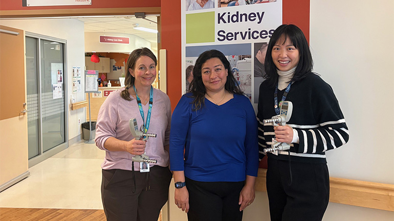 Thanks to funding from Fraser Valley Health Care Foundation and Michael Smith Health Research BC, Laila and her KT team partners, Shelly Messenger, dietitian practice lead, Nicole Huang, renal dietitian and Rebekah Sandhu, research dietitian and educator, are embarking on a two-year project to empower dietitians to be more comfortable using clinical tools—like the dynamometer—to assess patients.