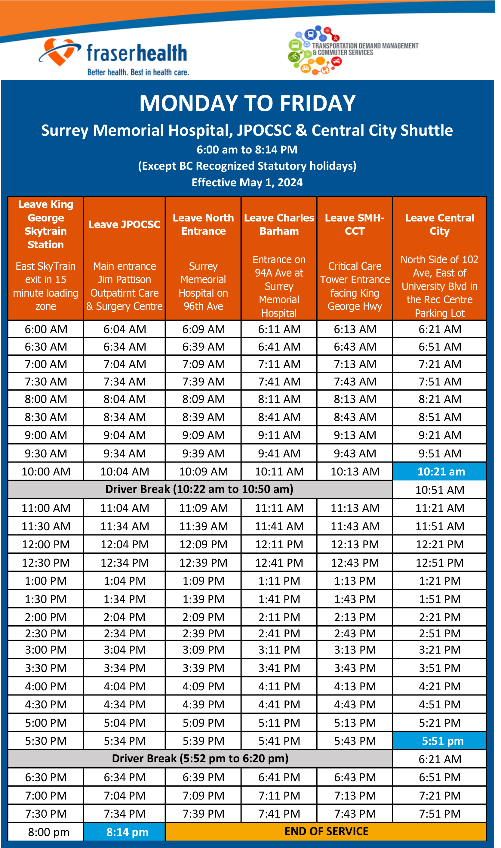 The Central Surrey Health Shuttle service links the King George SkyTrain station, Surrey Memorial Hospital Campus, Jim Pattison Outpatient Care and Surgery Centre and Fraser Health Central City.