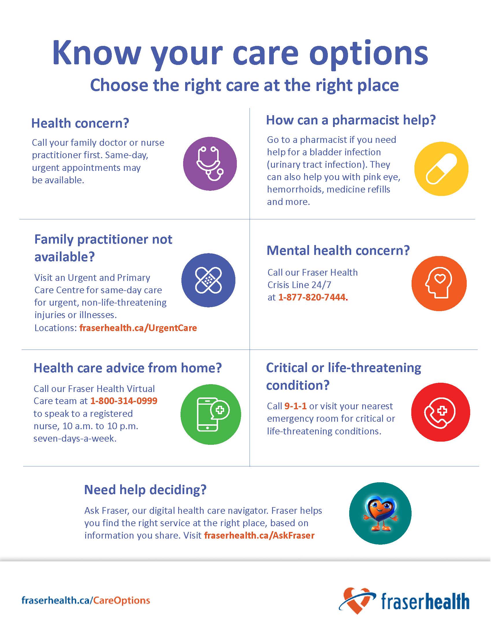 For mental health/substance use concerns, call the 24/7 Fraser Health Crisis Line at 604-951-8855 or toll free at 1-877-820-7444.